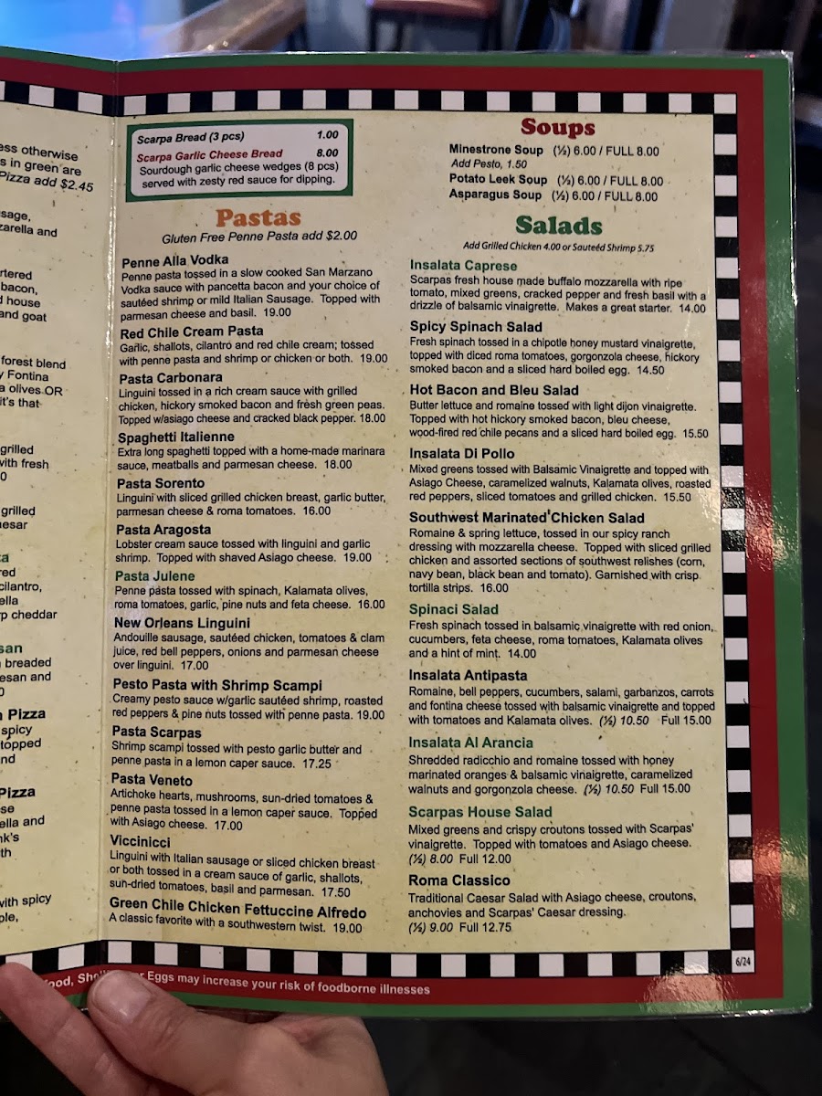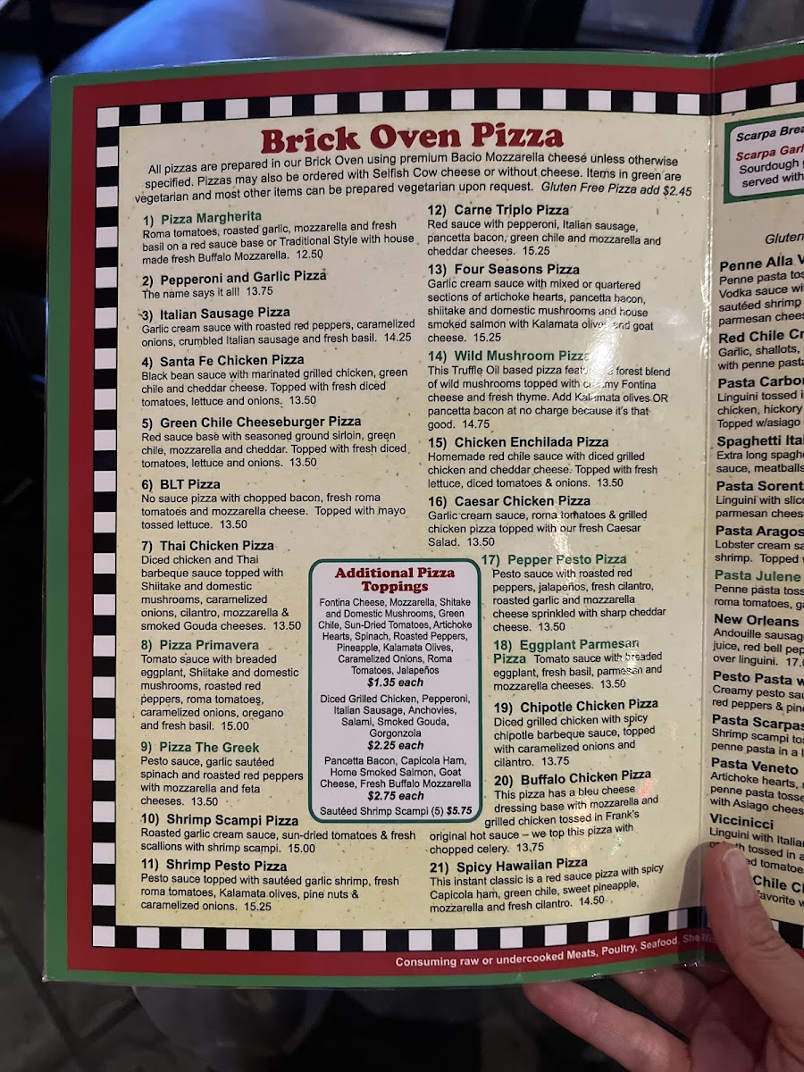 Introducing the menu at Scarpas, located in the heart of Albuquerque, emphasizes authentic Italian cuisine crafted with passion. Their brick oven pizzas are a must-try, featuring delightful options like the Pepperoni and Garlic Pizza, alongside unique offerings such as the Santa Fe Chicken Pizza, which combines black bean sauce, marinated chicken, and green chile for a local twist.